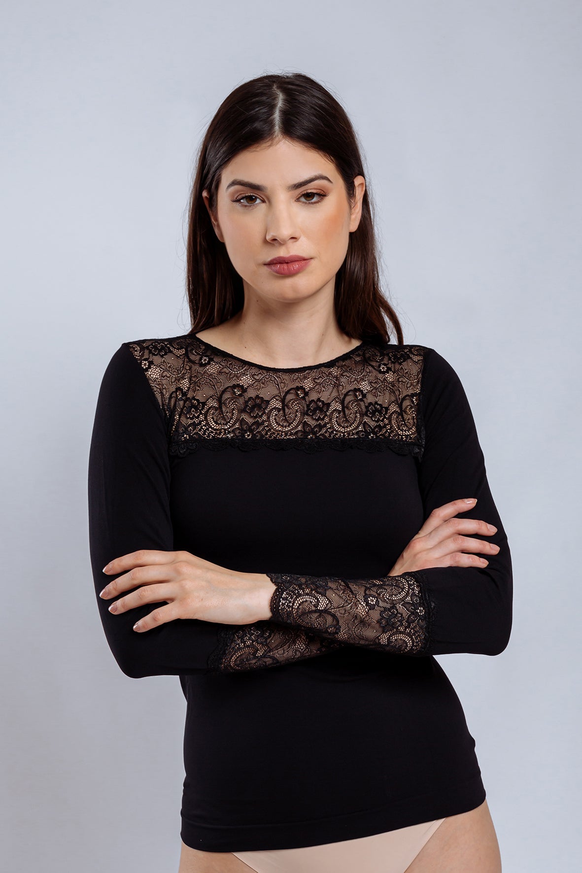 Camisola microfibra soft touch 80 den, parte frontal, costas e punho embelezado com delicada renda floral.